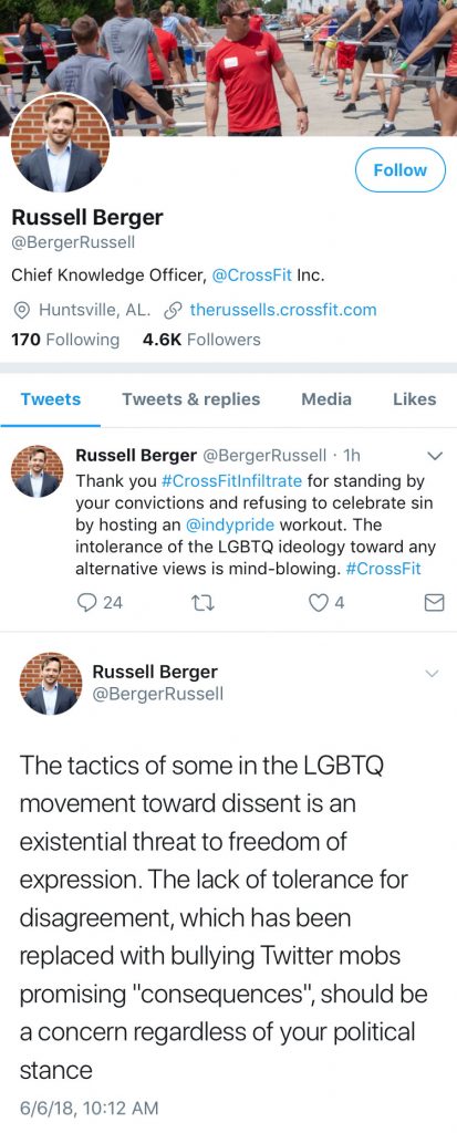 Yesterday, CrossFit HQ announced it had fired Russell Berger after he tweeted two tweets with disparaging remarks against the LGBTQ community. Both tweets were deleted but you can read them here.